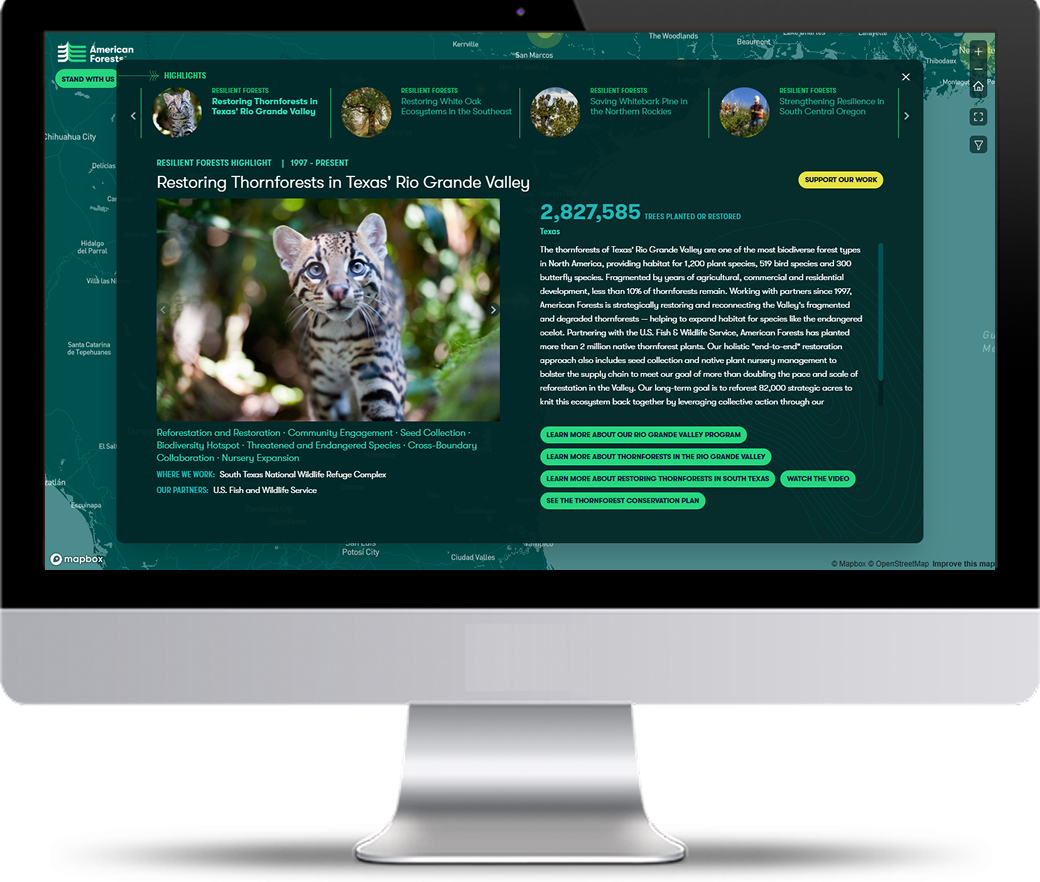 150 projects for forests. 150 projects for communities. 150 years of impact. For American Forests' 150th anniversary, I designed a custom, branded interactive map highlighting 300 projects across the United States and Hawaii.